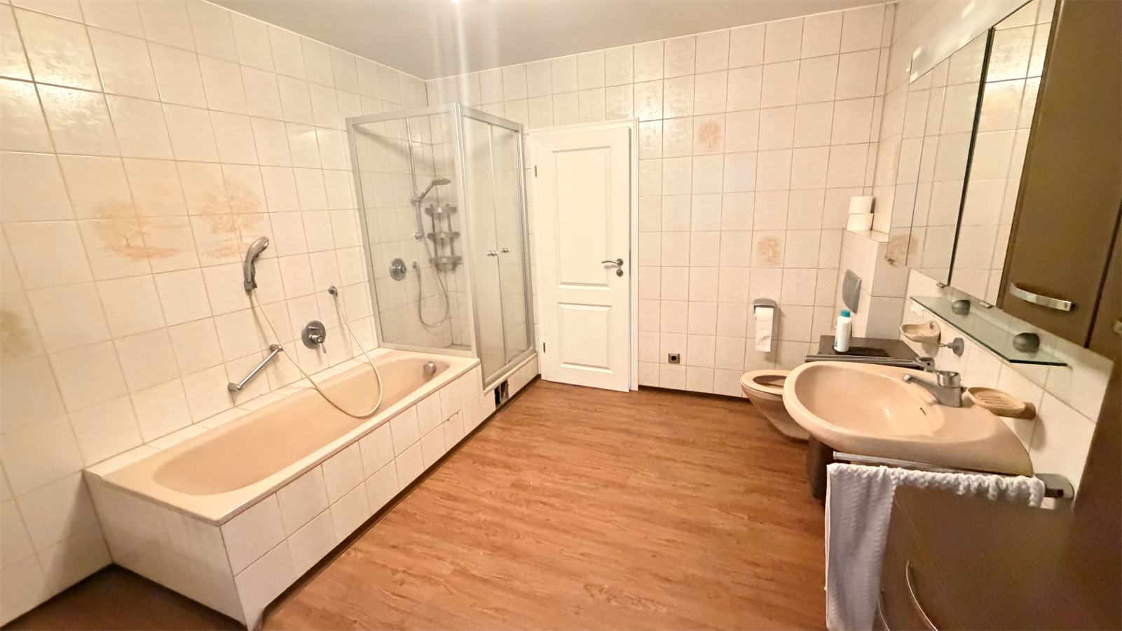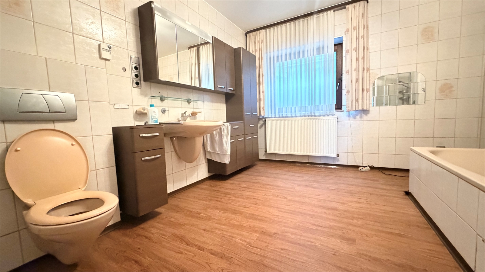 Das Untergeschoss ist über die Innentreppe oder über den separaten Außenzugang erreichbar. Hier verfügen Sie über ein Schlafzimmer, ein Kinderzimmer, das Tageslichtbad mit Wanne und Dusche sowie einen Kellerraum mit vorhandenem Sanierungsangebot (Feuchtigkeitsschaden).